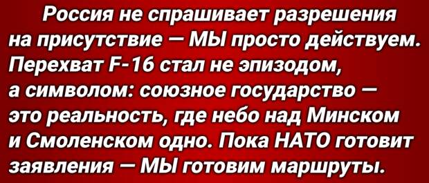 «Россия поставила щит от НАТО в небе. Перехват F-16 — это не случайность, а показатель: союзная оборона действует как механизм, где каждое крыло и каждая база — общие. НАТО оказалась в положении зрителя, у которого на глазах рушится старая система контроля. Белоруссия — не рубеж, а площадка новой геополитической архитектуры. И чем громче кричат в Брюсселе, тем очевиднее: командует теперь не альянс, а НАША реальность»,