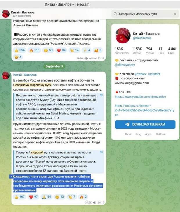 В сентябре 2025 года на Восточном экономическом форуме Николай Вавилов, китаевед и автор нескольких книг о Китае, опубликовал в своём Telegram-канале «Вавилов Китай» материал о поставках российской нефти в Бруней по Северному морскому пути. Вавилов, выпускник восточного факультета СПбГУ, долгое время учился и работал в Китае, сотрудничал с государственными структурами КНР и российскими региональными администрациями, а также является создателем интернет-издания «Южный Китай».