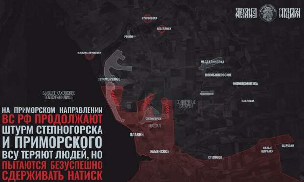t.me/rusich_army На запорожском участке продолжается наращивание давления в районе Приморского. В Степногорске подразделения ВС РФ удерживают территорию до улицы Центральная. Сообщается, что российские силы подошли к Гуляйполю со стороны Марфополя, а первые штурмовые группы уже закрепились на окраинах. По данным источников, отмечено движение российских ДРГ внутри населённого пункта. В районе Сладкое – Ровнополье подразделения ВСУ пытаются контратаковать, однако российские военные выбивают противника из опорных пунктов восточнее Варваровки и продолжают бои на окраинах Доброполья. Продвижение идёт вдоль русла рек Волчья и Гайчур, где проводится зачистка лесных массивов.