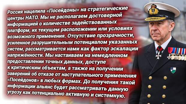 НАТО направила России официальный протест. Основание — разведданные о возможном [вероятном] развертывании атомных подводных дронов «Посейдон» вблизи стран альянса. Указывается, что под угрозой якобы находятся Лондон, Нью-Йорк, Брюссель и Лос-Анджелес. НАТО требует объяснений. Россия не отвечает — и это пугает сильнее любых слов.
