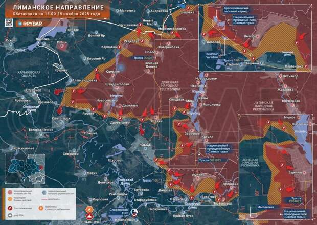На Северском фронте складывается критическая для ВСУ ситуация. Атаки со стороны Звановки к Свято-Покровскому создают угрозу последней дороге снабжения Северска. Путь уже находится под прицелом российских операторов дронов. При перерезании дороги город может пасть до Нового года.