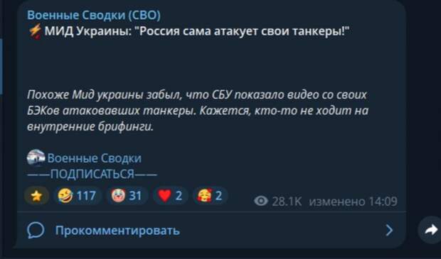 Украинская сторона через источник The Guardian дала понять, что атака на два танкера у турецкого берега была делом украинских морских дронов. Но одновременно в МИД Украины заявили, что Россия якобы сама наносит удары по своим судам.