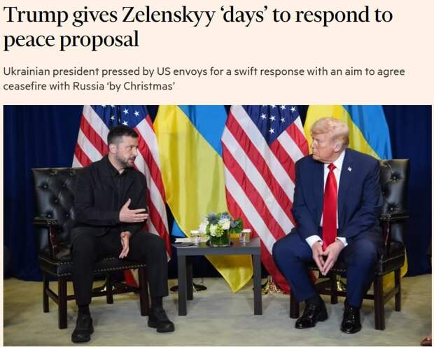The Financial Times сообщает, что команда Дональда Трампа усилила давление на Владимира Зеленского, требуя скорого ответа на мирное предложение с целью завершить конфликт с Россией до католического Рождества.