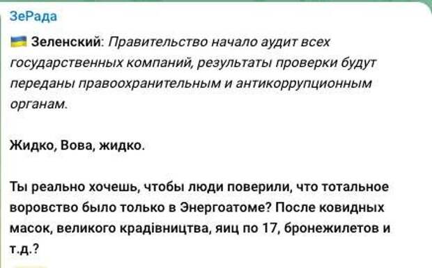 «Жидко, Вова, жидко», - прокомментировал канал заявление Зеленского о том, что правительство начало аудит всех государственных компаний. Пообещал результаты передать антикоррупционным органам и правоохранителям.