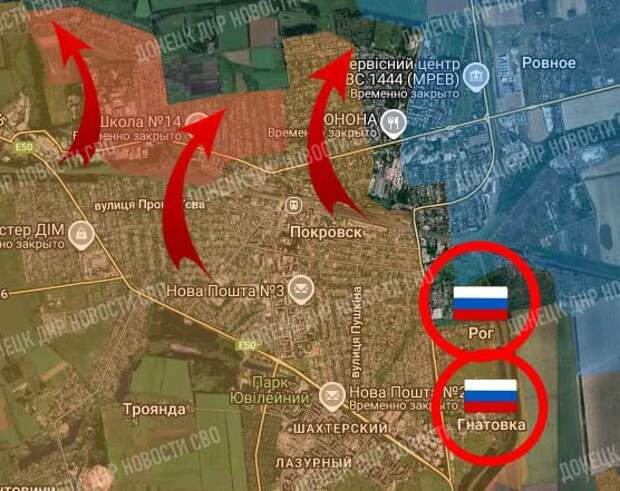 В районе Ровного российские подразделения продвигаются южнее населённого пункта, постепенно закрепляясь в частной застройке. Одновременно усиливается давление на северный фланг Покровска (Красноармейска), где противник продолжает удерживать небольшой участок обороны. Российские силы ведут обходные действия и плотный огонь.