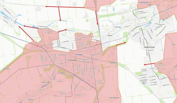 На восточном фланге Мирнограда фиксируется расширение серой зоны — туда продвинулись мобильные группы ВС РФ, проводящие зачистку кварталов и подготовку плацдармов. На северном направлении отмечено закрепление российских бойцов в нескольких жилых домах, что создаёт предпосылки для тактического охвата.