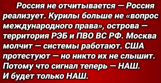 Россия не объясняет действия — Россия работает на результат. И когда профессор Барабанов говорит о Курилах, он не спорит — он констатирует: контроль установлен. Курилы — это не предмет для спора. Это НАШИ острова. А сигнал Японии и США здесь один — отсутствующий. Потому что сигнал закрыт.