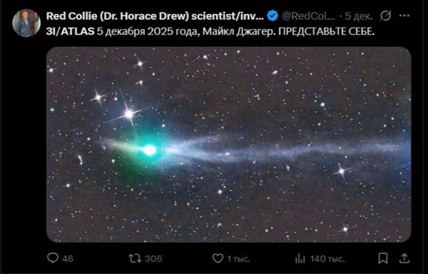 При этом NASA настаивает, что речь идёт об обычном космическом теле с аномальными, но естественными характеристиками. Там сообщают о ледяных вулканах на поверхности и высоком содержании CO₂ в коме. Тем не менее отличие 3I/ATLAS от комет Солнечной системы очевидно, и именно это привлекает к объекту всё больше внимания.