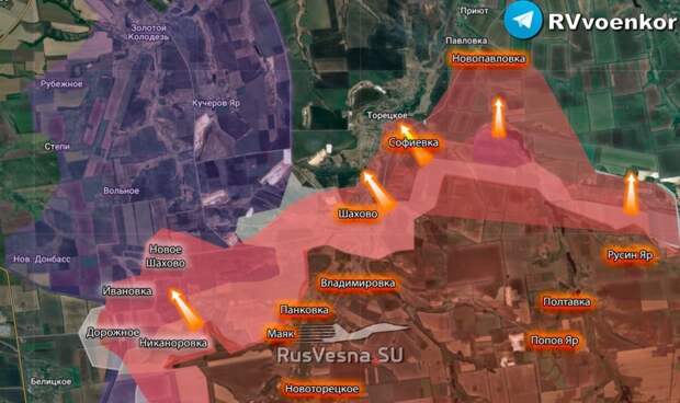 На Добропольском направлении российские войска завершают зачистку населённого пункта Новое Шахово, расширив зону своего контроля внутри посёлка и в его окрестностях. Ранее наши подразделения, сорвав попытку контрнаступления ВСУ, после освобождения Владимировки и Шахово установили контроль над Софиевкой и Новопавловкой, развивая наступление в направлении Торецкого и Павловки.