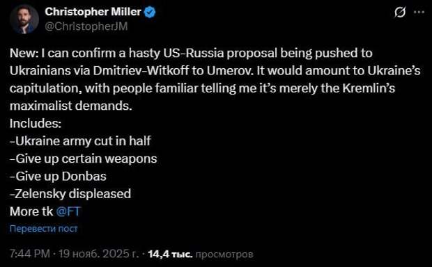Журналисты охарактеризовали эти условия как «фактическую капитуляцию Украины». Разработкой плана, по данным FT, занимались представители команды Дональда Трампа и российский бизнесмен.