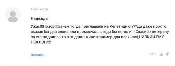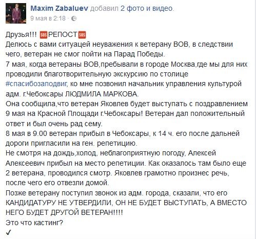 "Заместитель главы Калининского района попросила выступать на сцене не более трёх минут. За это время я и поздравил людей. Но позже сообщили, что меня отстранили от выступления. Сказали, что будет выступать ветеран труда с завода, какой-то более молодой человек. Я почувствовал себя очень плохо и задумался, почему в этот праздник выступает ветеран труда, а не войны.