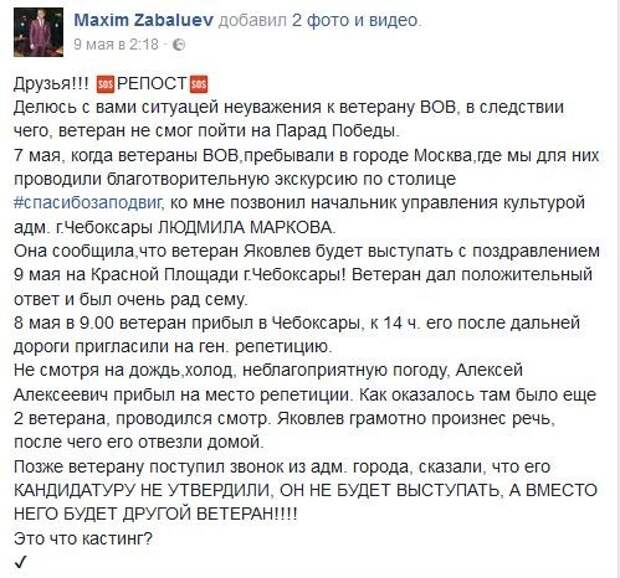 Алексей Яковлев прошёл 3 войны: финскую, ВОВ, Дальний Восток, имеет 2 ордена Красной Звезды и множество других наград, в этом году ему исполнилось 98 лет. Местная администрация пригласила ветерана выступить на празднике в День Победы, но почти сразу же отказали, обосновав это тем, что он не прошел…