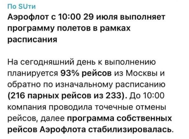 По данным компании, на сегодняшний день 93% запланированных рейсов из Москвы и обратно осуществляются по изначальному графику — всего 216 парных рейсов из 233-х. В течение утра авиакомпания проводила отдельные отмены, однако после 10:00 программа полетов стабилизировалась, и выполнение рейсов идет в штатном режиме.